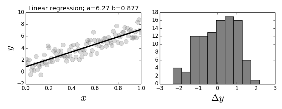 # #The panel on the left shows the data and regression line. The panel on the right shows a histogram of the regression errors.