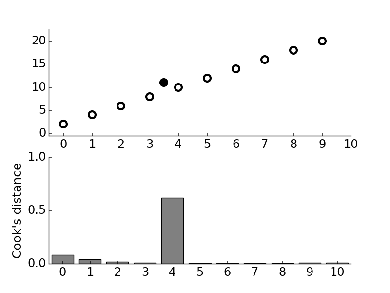 # The upper panel shows data that fit on a line and an outlier point (filled black circle). The lower panel shows the calculated Cook's distance for the data in upper panel and shows that the tenth point (i.e., the outlier) has disproportionate influence.