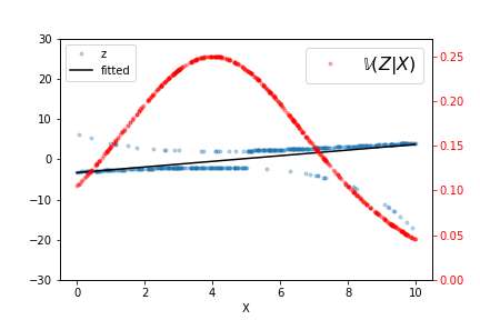The output of this fit is shown in Figure, along with the raw data and $\mathbb{V}(Z|X)$ for this particular fitted $\beta_i$. Iterating a few more times refines the estimated line but it does not take many such iterations to converge. As indicated by the variance line, the fitted line favors the data at either extreme.