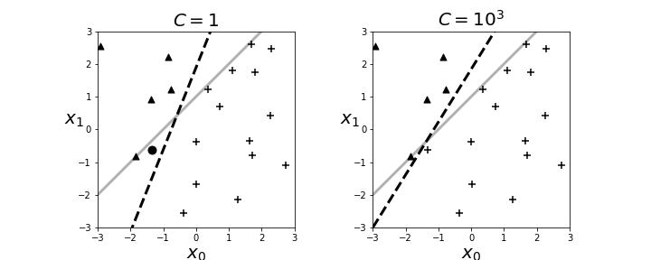 The resulting boundary is shown in the left panel in Figure. The crosses and triangles represent the two classes we created above, along with the separating gray line. The logistic regression fit produces the dotted black line. The dark circle is the point that logistic regression categorizes incorrectly. The regularization parameter is $C=1$ by default. Next, we can change the strength of the regularization parameter as in the following,
