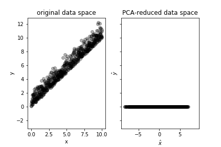 The left panel shows the original two-dimensional data space of two easily distinguishable classes and the right panel shows the reduced the data space transformed using PCA. Because the two classes are separated along the principal component discovered by PCA, the classes are preserved under the transformation.