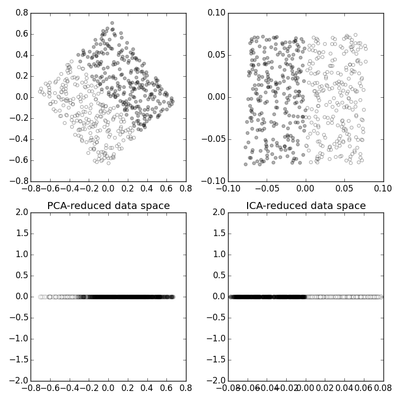 The panel on the top left shows two classes in a plane after a rotation. The bottom left panel shows the result of dimensionality reduction using PCA, which causes mixing between the two classes. The top right panel shows the ICA transformed output and the lower right panel shows that, because ICA was able to un-rotate the data, the lower dimensional data maintains the separation between the classes.