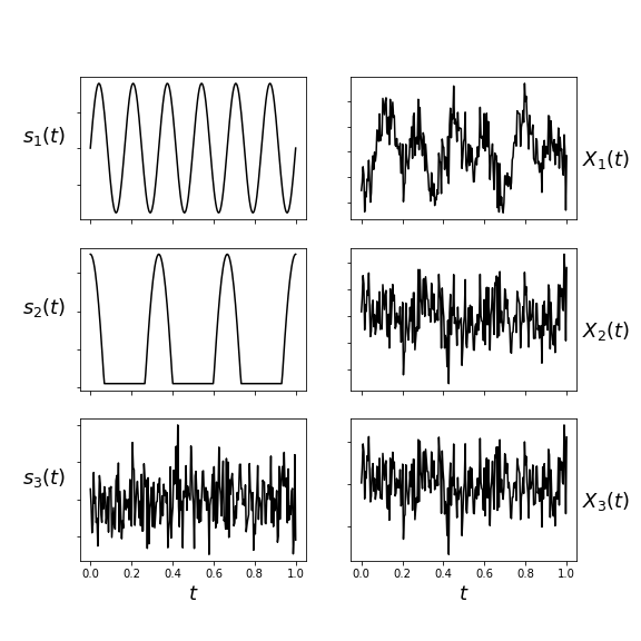 The individual signals ($s_i(t)$) and their mixtures ($X_i(t)$) are
