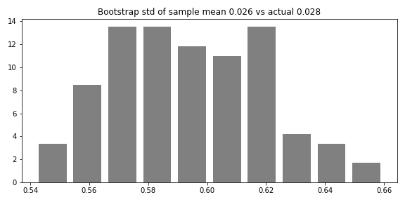 _=ax.set_title('Bootstrap std of sample mean %3.3f vs actual %3.3f'%