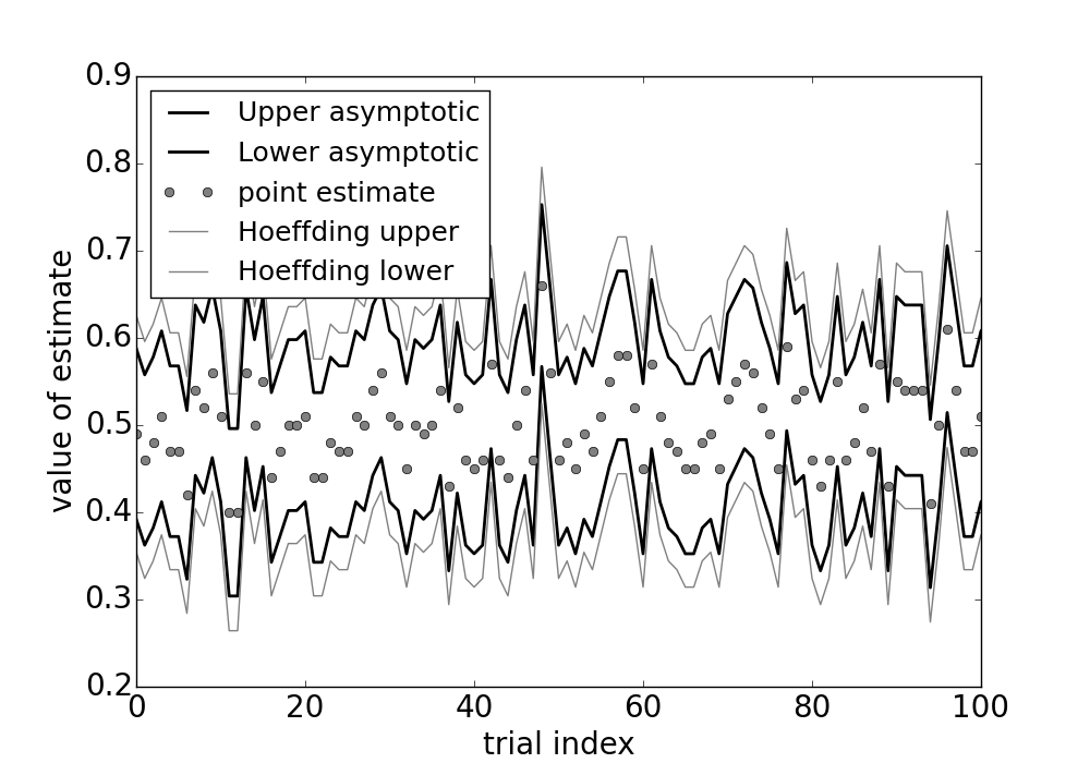 Figure shows the asymptotic confidence intervals and the Hoeffding-derived confidence intervals. As shown, the Hoeffding intervals are a bit more generous than the asymptotic estimates. However, this is only true so long as the asympotic approximation is valid. In other words, there exists some number of $n$ samples for which the asymptotic intervals may not work. So, even though they may be a bit more generous, the Hoeffding intervals do not require arguments about asymptotic convergence. In practice, nonetheless, asymptotic convergence is always in play (even if not explicitly stated).