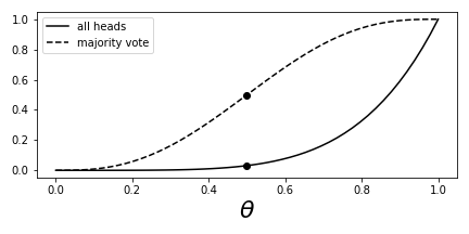 Figure shows the power function for both the majority vote and the all-heads tests.