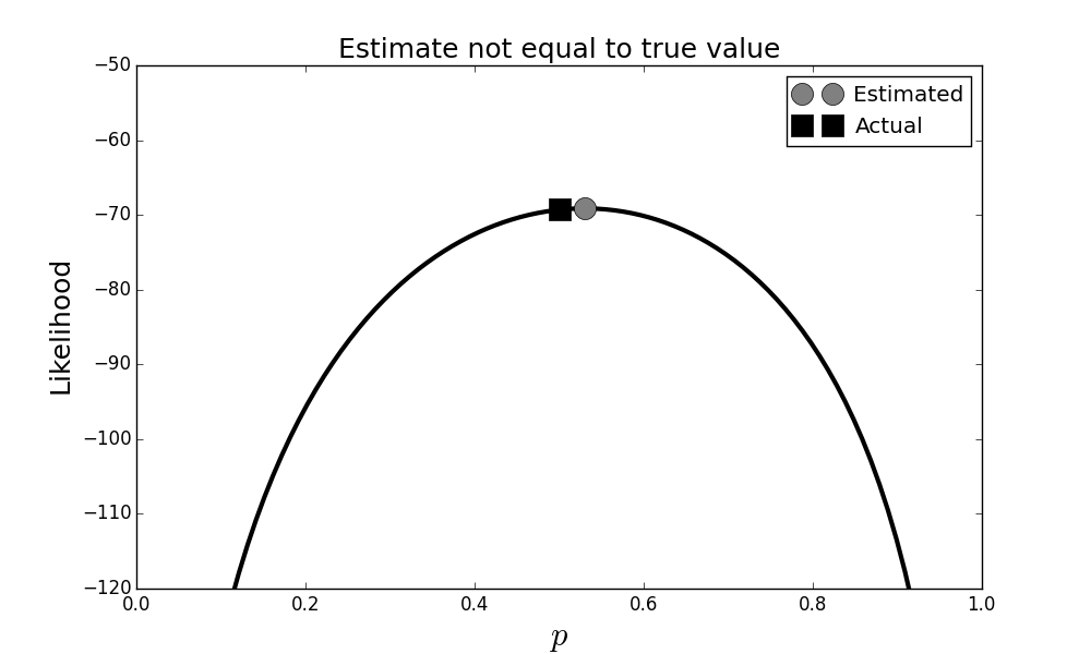 Maximum likelihood estimate vs. true parameter. Note that the estimate is slightly off from the true value. This is a consequence of the fact that the estimator is a function of the data and lacks knowledge of the true underlying value.