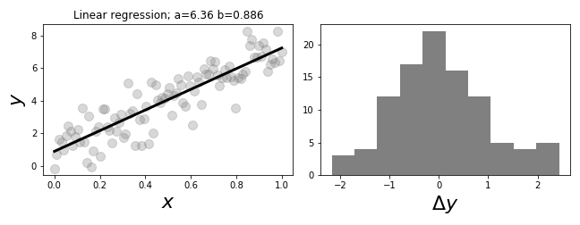 The panel on the left shows the data and regression line. The panel on the right shows a histogram of the regression errors.