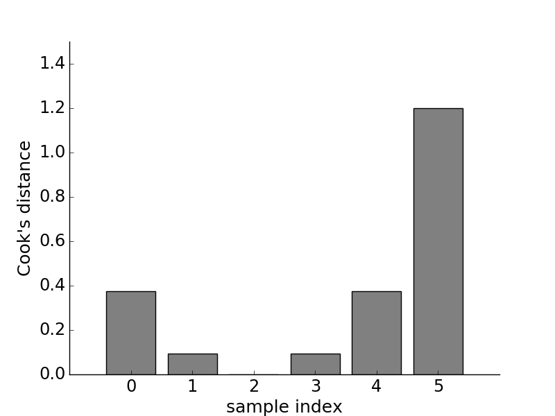 The calculated Cook's distance for the data in [Figure](#fig:Regression_005).
