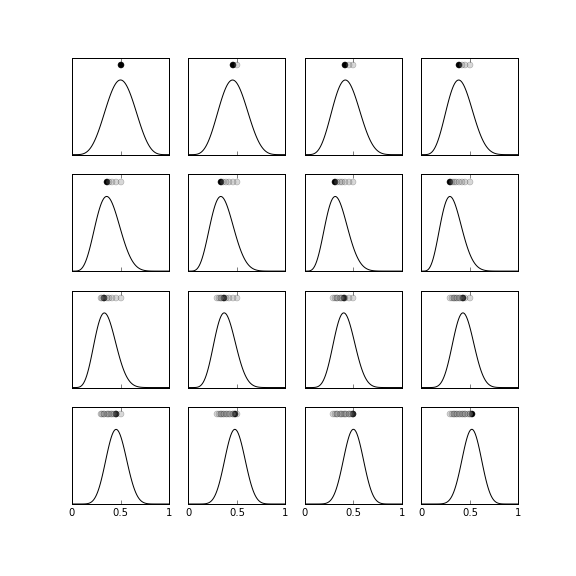 This is a very different strategy because we are using every data sample $x_k$ as a parameter for the posterior distribution instead of lumping all the samples together in a summation (this is where we got the $k$ term in the prior case). This case is much harder to analyze because now every incremental posterior distribution is itself a random function because of the injection of the $x$ random variable. On the other hand, this is more in line with more general Bayesian methods because it is clear that the output of this estimation process is a posterior distribution function, not just a single parameter estimate. Figure illustrates this method. The graph in the top row, far left shows the prior probability ($\beta(6,6)$) and the dot on the top shows the most recent MAP-estimate for $\theta$. Thus, before we obtain any data, the peak of the prior probability is the estimate. The next graph to right shows the effect of $x_0=0$ on the incremental prior probability. Note that the estimate has barely moved to the left. This is because the influence of the data has not caused the prior probability to drift away from the original $\beta(6,6)$-distribution. The first two rows of the figure all have $x_k=0$ just to illustrate how far left the original prior probability can be moved by those data. The dots on the tops of the sub-graphs show how the MAP estimate changes frame-by-frame as more data is incorporated. The remaining graphs, proceeding top-down, left-to-right show the incremental change in the prior probability for $x_k=1$. Again, this shows how far to the right the estimate can be pulled from where it started. For this example, there are an equal number of $x_k=0$ and $x_k=1$ data, which corresponds to $\theta=1/2$.