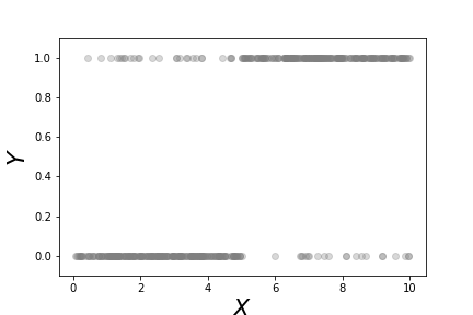 To generalize this technique beyond logistic regression, we need to re-think the problem more abstractly as the data set $\lbrace x_i, y_i \rbrace$. We have the $y_i \in \lbrace 0,1 \rbrace$ data modeled as Bernoulli random variables. We also have the $x_i$ data associated with each $y_i$, but it is not clear how to exploit this association. What we would like is to construct $\mathbb{E}(Y|X)$ which we already know (see ch:prob) is the best MSE estimator. For this problem, we have