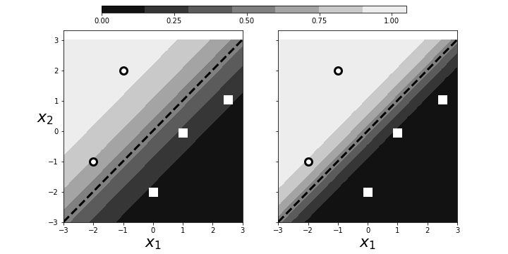 describes the same hyperplane. This means that we can multiply $\boldsymbol{\beta}$ by an arbitrary scalar and still get the same geometry. However, because of $\exp(-\alpha\boldsymbol{\beta}^T \mathbf{x})$ in Equation (2), this scaling determines the intensity of the probability attributed to $\mathbf{x}$. This is illustrated in Figure. The panel on the left shows two categories (squares/circles) split by the dotted line that is determined by $\boldsymbol{\beta}^T\mathbf{x}=0$. The background colors show the probabilities assigned to points in the plane. The right panel shows that by scaling with $\alpha$, we can increase the probabilities of class membership for the given points, given the exact same geometry. The points near the boundary have lower probabilities because they could easily be on the opposite side. However, by scaling by $\alpha$, we can raise those probabilities to any desired level at the cost of driving the points further from the boundary closer to one. Why is this a problem? By driving the probabilities arbitrarily using $\alpha$, we can overemphasize the training set at the cost of out-of-sample data. That is, we may wind up insisting on emphatic class membership of yet unseen points that are close to the boundary that otherwise would have more equivocal probabilities (say, near $1/2$). Once again, this is another manifestation of bias/variance trade-off.