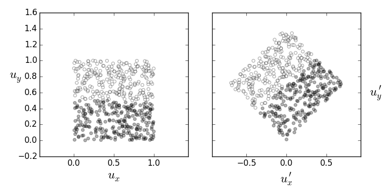 To develop some intuition as to how ICA accomplishes this feat, consider the following two-dimensional situation with two uniformly distributed independent variables, $u_x,u_y \sim \mathcal{U}[0,1]$. Suppose we apply the following orthogonal rotation matrix to these variables,