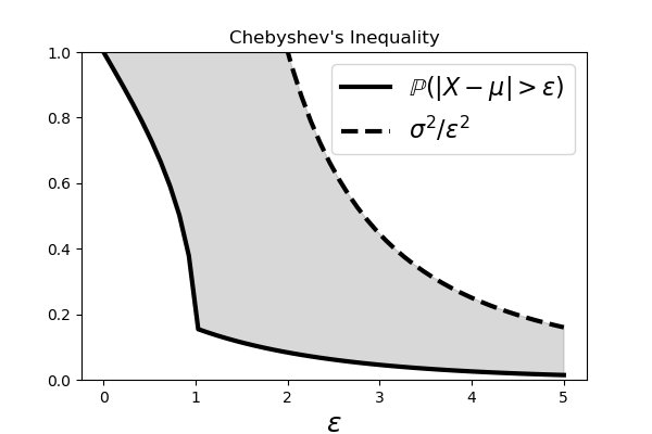 The shaded area shows the region between the curves on either side of the Chebyshev Inequality.