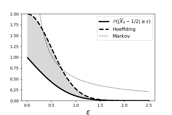 where $c=(b-a)^2$. We will see this inequality again in the machine learning chapter. Figure shows the Markov and Hoeffding bounds for the case of ten identically and uniformly distributed random variables, $X_i \sim \mathcal{U}[0,1]$. The solid line shows $\mathbb{P}(\vert \overline{X}_n - 1/2 \vert > \epsilon)$. Note that the Hoeffding Inequality is tighter than the Markov Inequality and that both of them merge when $\epsilon$ gets big enough.