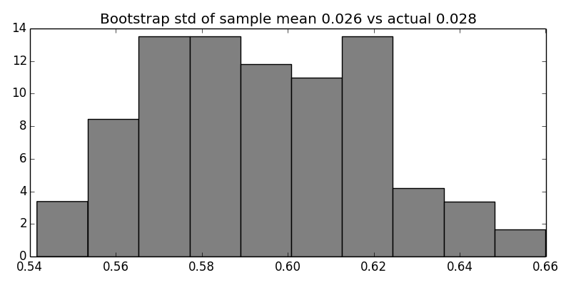 _=ax.set_title('Bootstrap std of sample mean %3.3f vs actual %3.3f'%