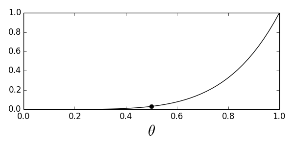 Power function for the all-heads test. The dark circle indicates the value of the function indicating $\alpha$.