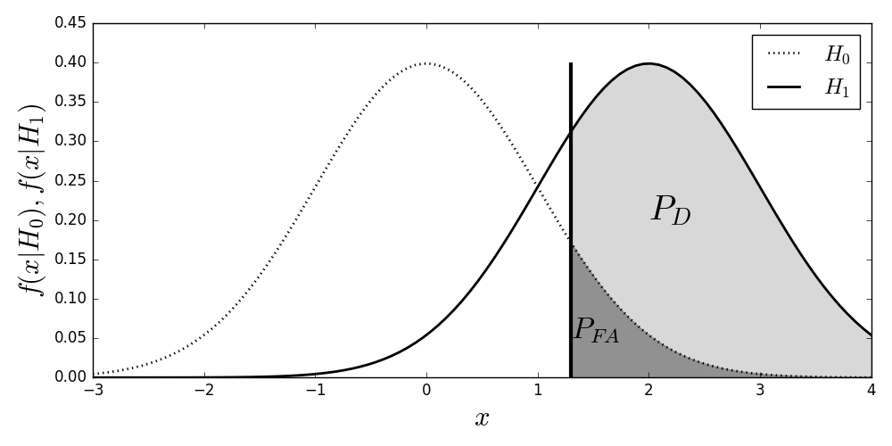 By choosing some acceptable values for either of these errors, we can solve for the other one. The practice is usually to pick a value of $P_{FA}$ and then find the corresponding value of $P_{FN}$. Note that it is traditional in engineering to speak about detection probability, which is defined as